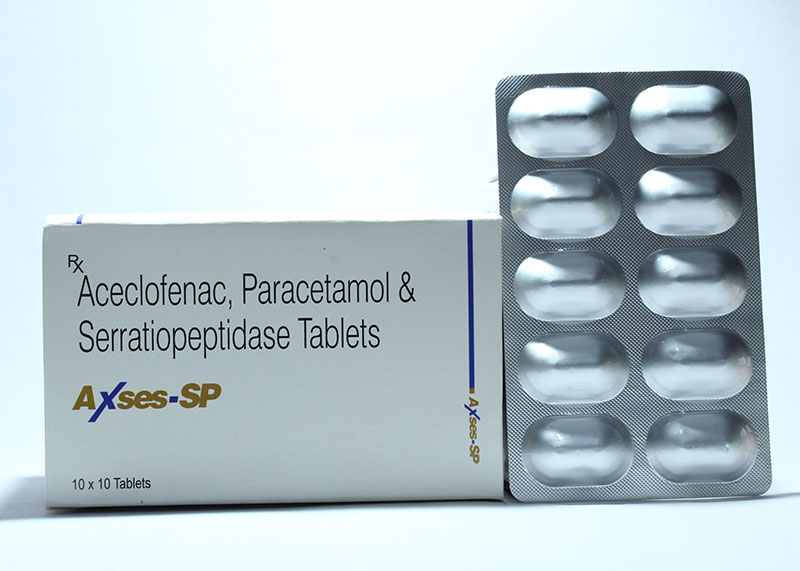 | AXSES -SP | Aceclofenac 100mg, Paracetamol 325mg Serratiopeptidase 15mg Tablet | 10x10 Alu-Alu | View Catalog | View Product |