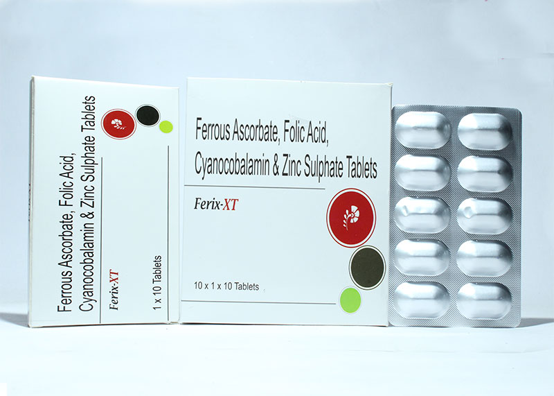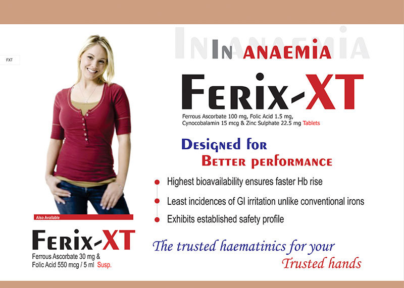 | FERIX-XT | Ferrous Ascorbate 100mg, Folic Acid I.P. 1.5mg, Cyanocobalamin 15mcg, Zinc 22.5mg Tablet | 10x10 Alu-Alu | View Catalog | View Product |