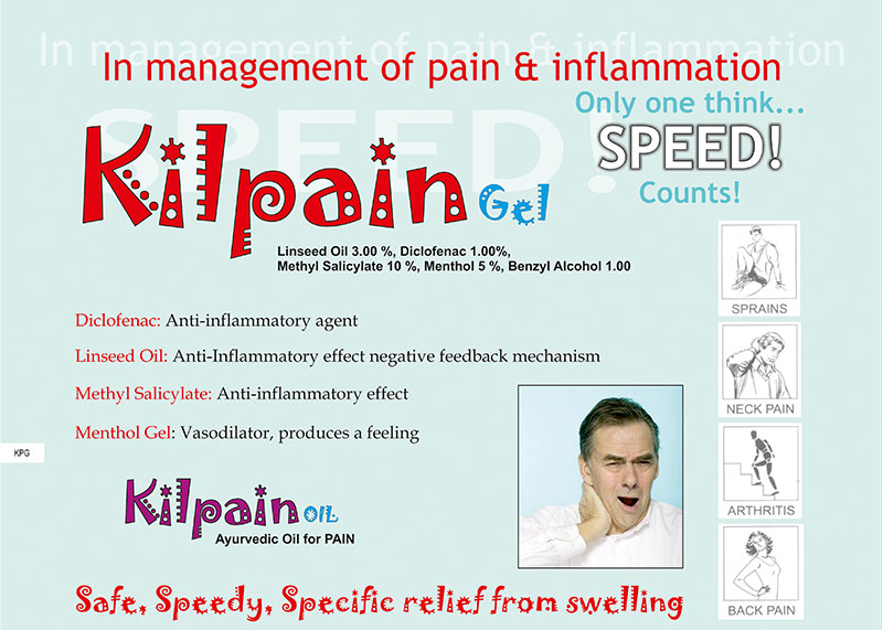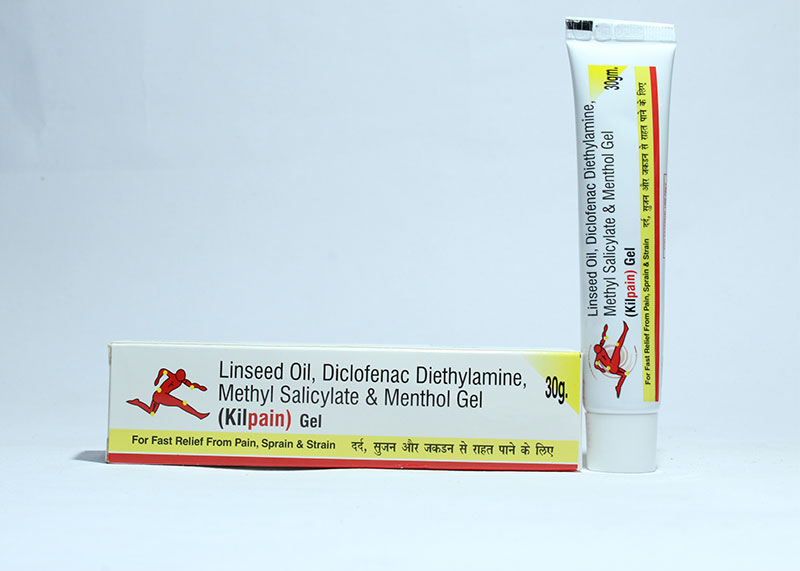 | KILPAIN GEL | Linseed Oil 3.00 % w/w, Diclofenac Sodium 1.00 % w/w, Methyl Salicylate 10.00 % w/w, Menthol 5.00 % w/w, Benzyl Alcohol 1.00 % w/w Ointment | 25x30GM | View Catalog | View Product |