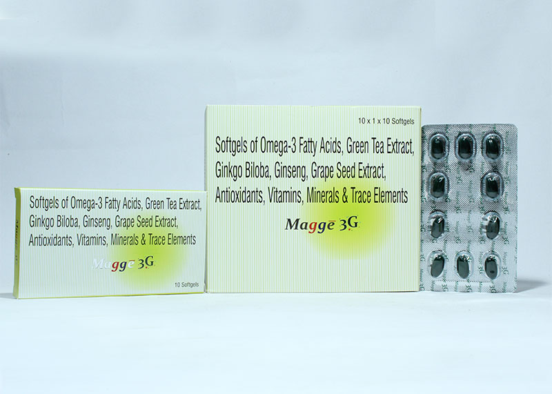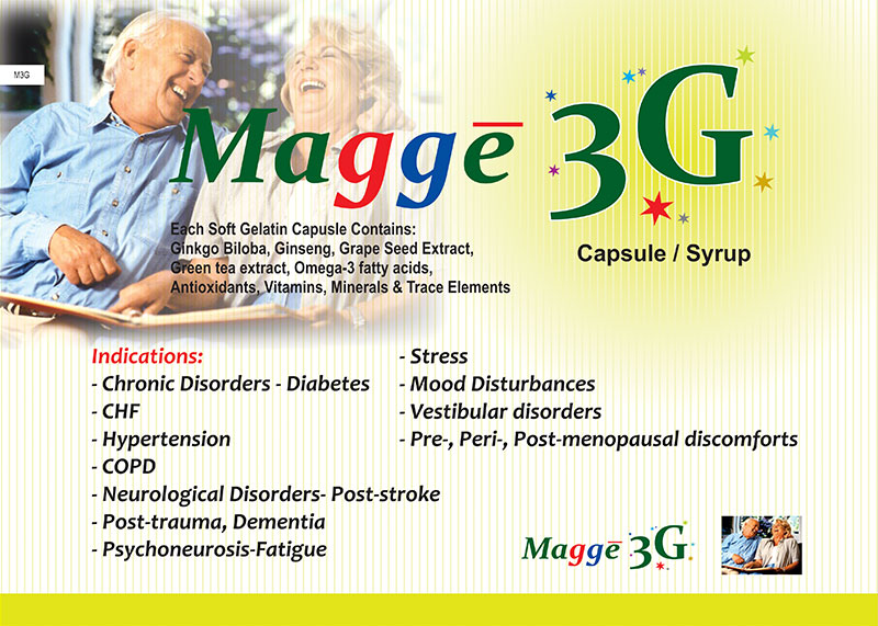 | MAGGE-3G | Omega-3 Fatty Acids, Green Tea Extract, Ginkgo Biloba, Ginseng, Grape Seed Extract, Antioxidants, Vitamins, Minerals & Trace Elements Soft Gelatin Capsule | 10x1x10 Blister | View Catalog | View Product |