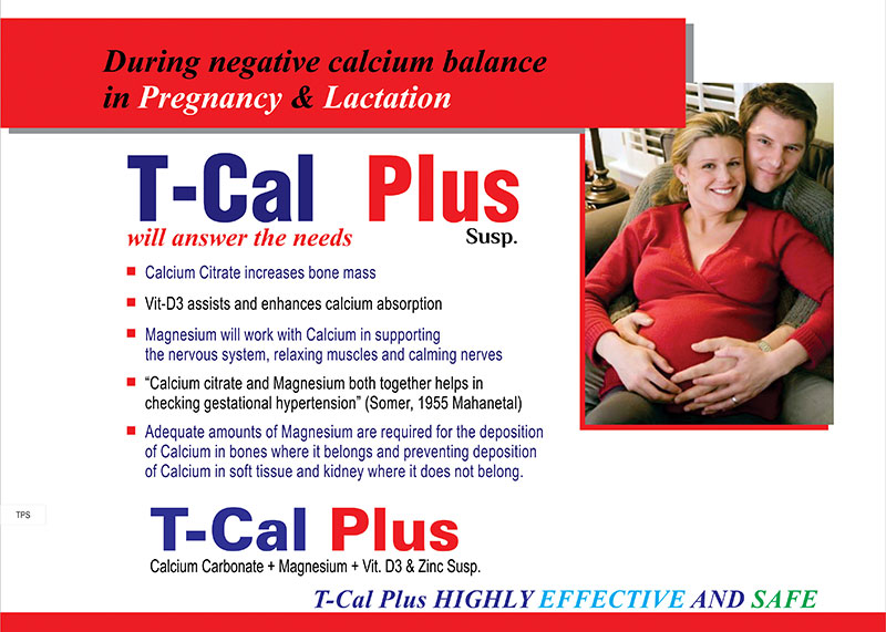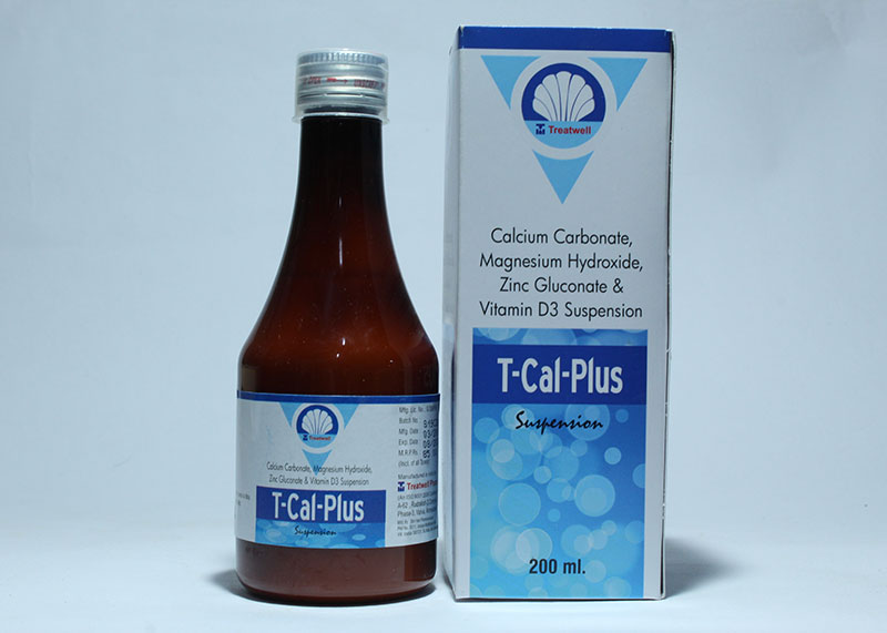 | T-CAL PLUS SUSP | Calcium carbonate IP 150mg, Vitamin D3 IP 200 IU, Magnesium Hydroxide IP25mg, Zinc 1.5mg Suspension | 200ML 1C/S=60 | View Catalog | View Product |