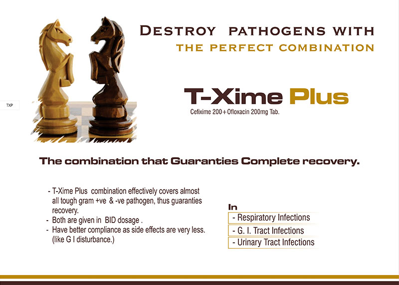 | T-XIME PLUS | Cefixime 200mg with Ofloxacin 200mg Tablet | 10x10 Alu-Alu | View Catalog | View Product |
