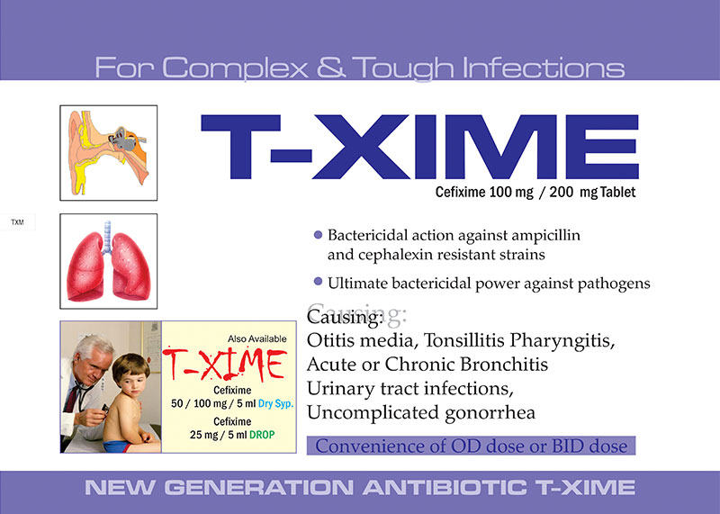 | T-XIME- 100 | Cefixime 100mg Tablet | 10x10 Alu-Alu | View Catalog | View Product |
