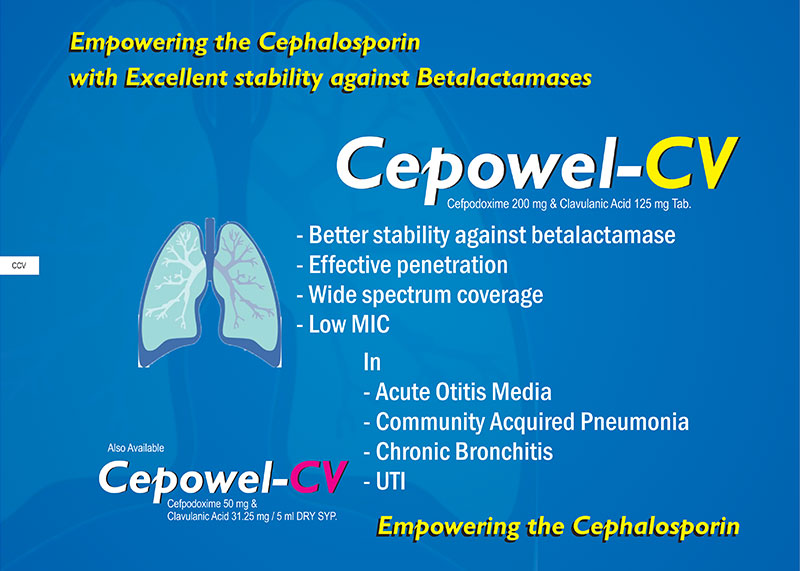 | CEPOWEL- CV 325 | Cefpodoxime 200 mg with Clavulanate Acid 125mg Tablet | 10x6 Strip | View Catalog | View Product |