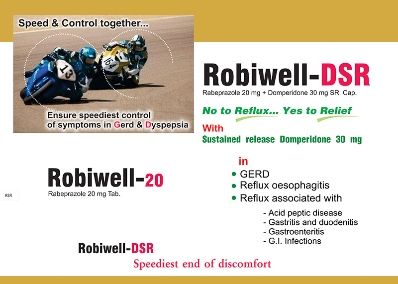 | ROBIWEL-DSR | Rabeprazole 20mg with Domperidone 30mg (SR) Capsule | 10x10 Strip | View Catalog | View Product |