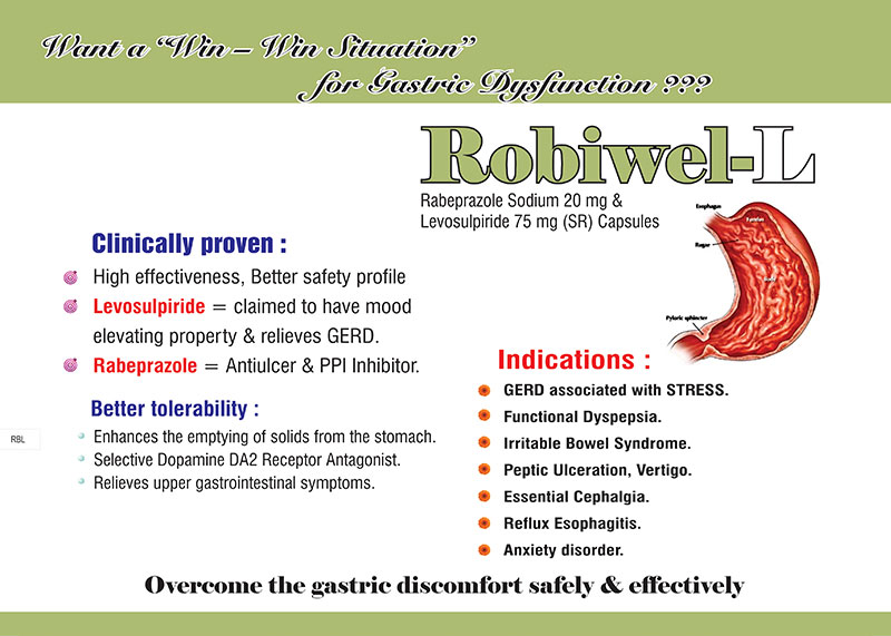 | ROBIWEL-L | Rabeprazole Sodium 20mg with Levosulpiride 75mg (SR) Capsule | 10x10 Alu-Alu | View Catalog | View Product |