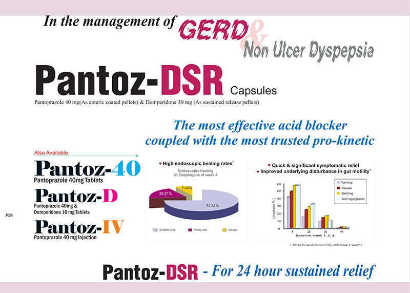 | PANTOZ-DSR | Pantoprazole 40mg Domperidone 30mg (SR) Capsule | 10x10 Alu-Alu | View Catalog | View Product |