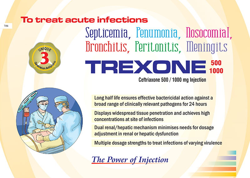 | TREXONE- 1000 | Ceftriaxone 1000mg Injection | 20x1Vail | View Catalog | View Product |