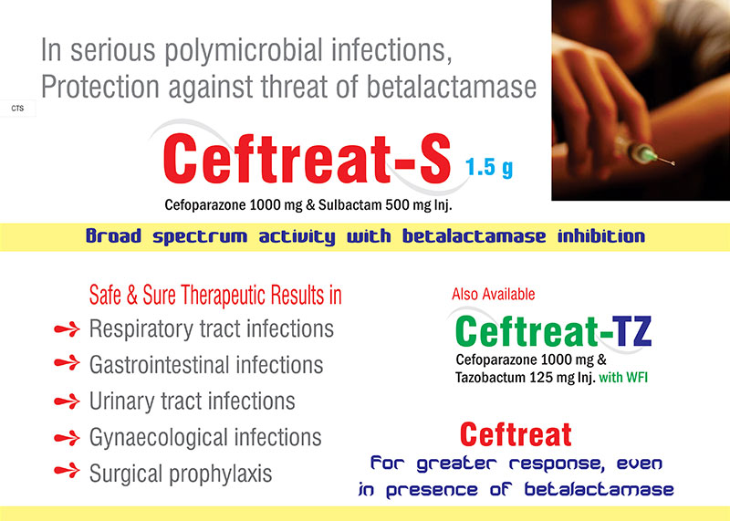 | CEFTREAT-S 1.5 | Cefoparazone 1000mg with Sulbactum 500mg Injection | 20x1Vail | View Catalog | View Product |