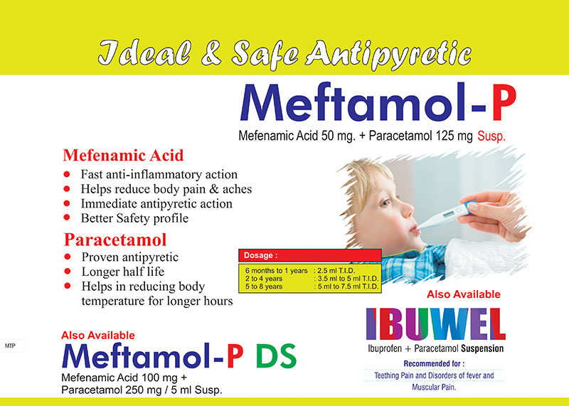 | MEFTAMOL-P | Mefenamic Acid 50mg with Paracetamol 125mg Suspension | 25x60ML | View Catalog | View Product |
