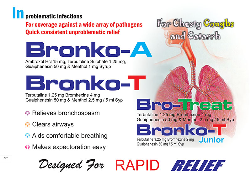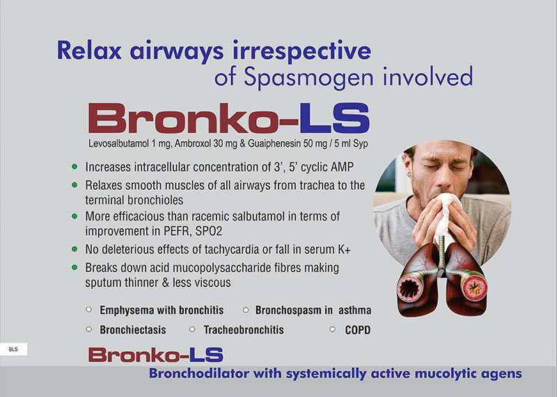 | BRONKO-LS 100ML | LEVOSALBUTAMOL 1MG, AMBROXOLHCL 30MG, GUAIPHENESIN 50MG SYRUP | 25X100ML | View Catalog | View Product |