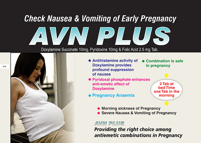 | AVN PLUS | Doxylamine Succinate 10mg Pyridoxine 10mg, Folic Acid 2.5mg Tablet | 10x10 Alu-Alu | View Catalog | View Product |