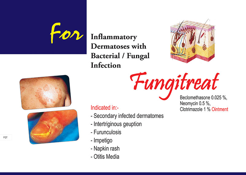 | FUNGITREAT | Beclomethasone 0.025%, Neomycin 0.5% & Clotrimazole 1% Ointment | 15gm | View Catalog | View Product |