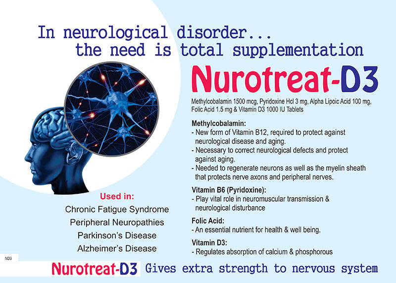 | NUROTREAT-D3 | Methylcobalamin 1500mcg, Alpha lipoic Acid 100mg, Pyridoxine 3mg & Folic Acid 1.5mg, Vitamin D3 1000 IU Tablet | 10x10 Alu-Alu | View Catalog | View Product |