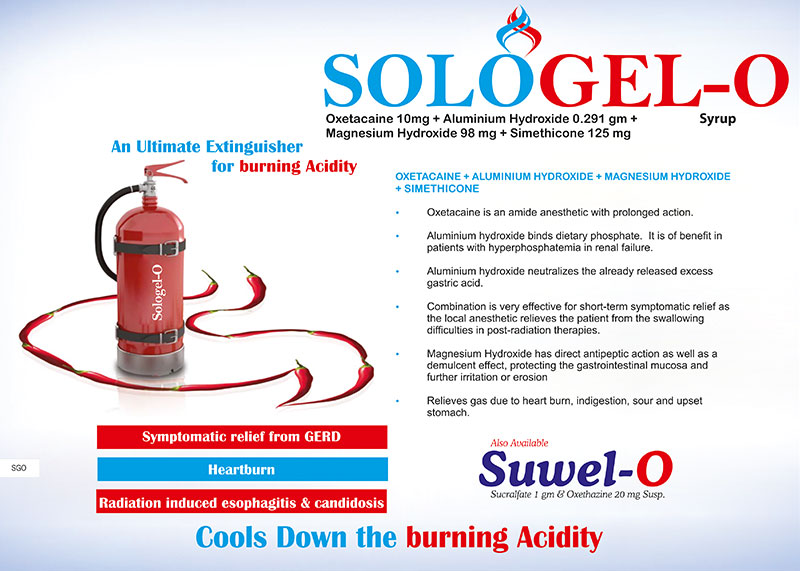 | SOLOGEL-O | Oxetacaine 10mg, Aluminum Hydroxide 0.291mg, Magnesium Hydroxide 98mg Sugar Free Suspension | 170ML 1C/S=72 | View Catalog | View Product |