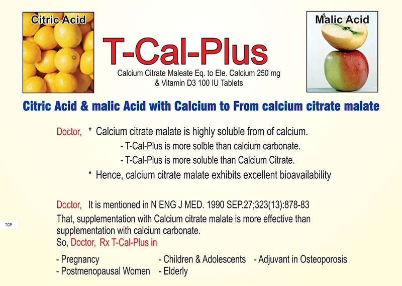 | T-CAL PLUS TAB | Calcium Citrate Maleate 250mg with Vit. D3 100 I.U Chewable Tablet | 30 Tab. Bottle | View Catalog | View Product |