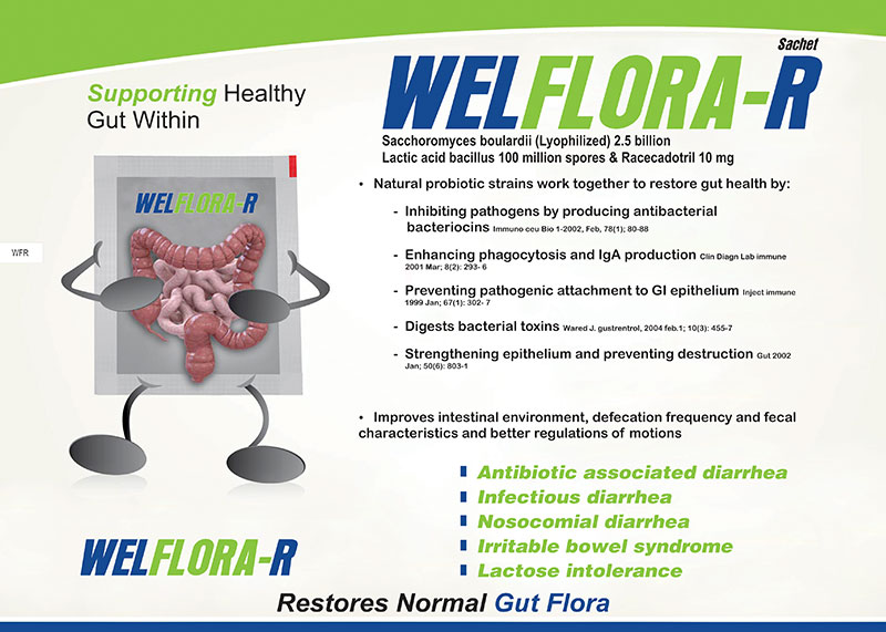 | WELFLORA-R SACHET | Saccharomyces Boulardi (Lyophillized) 2.5 billion, Lactic acid Bacillus 100 Million Spores, Racecadotril 10mg Sachet | 20x1GM | View Catalog | View Product |